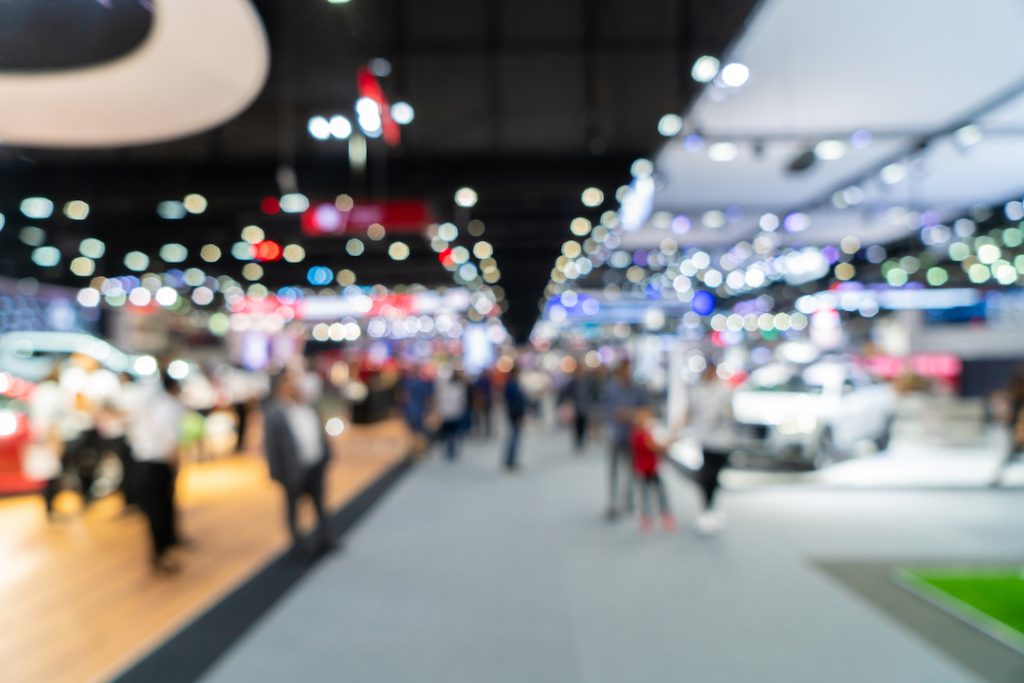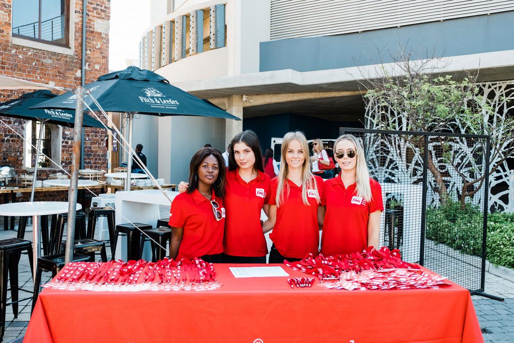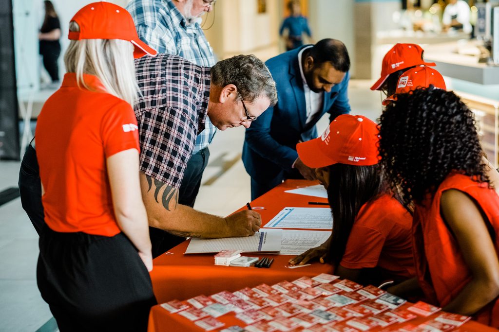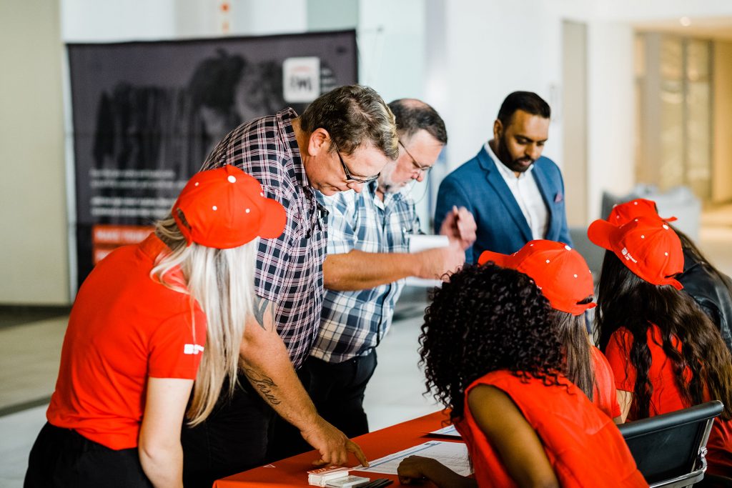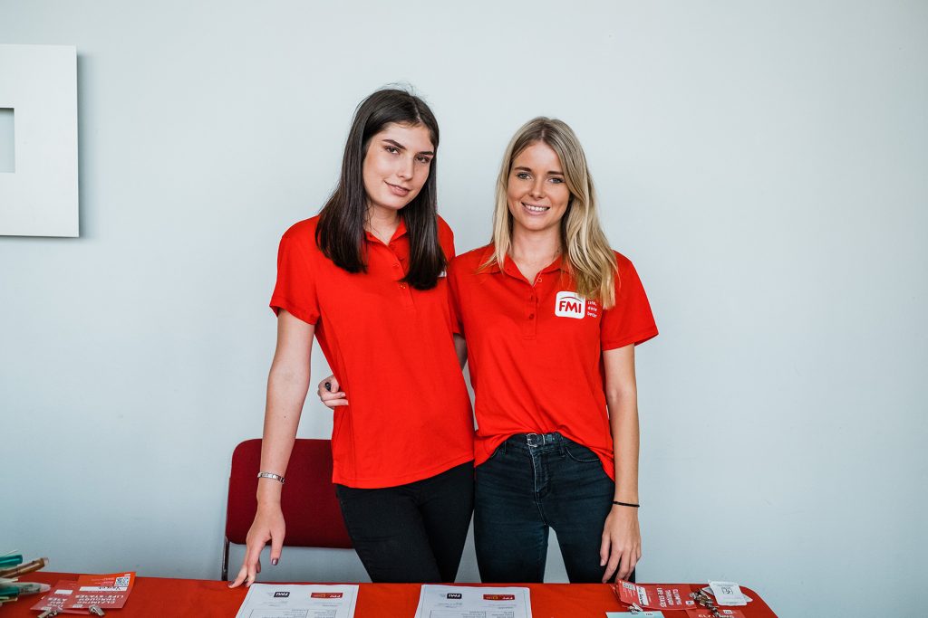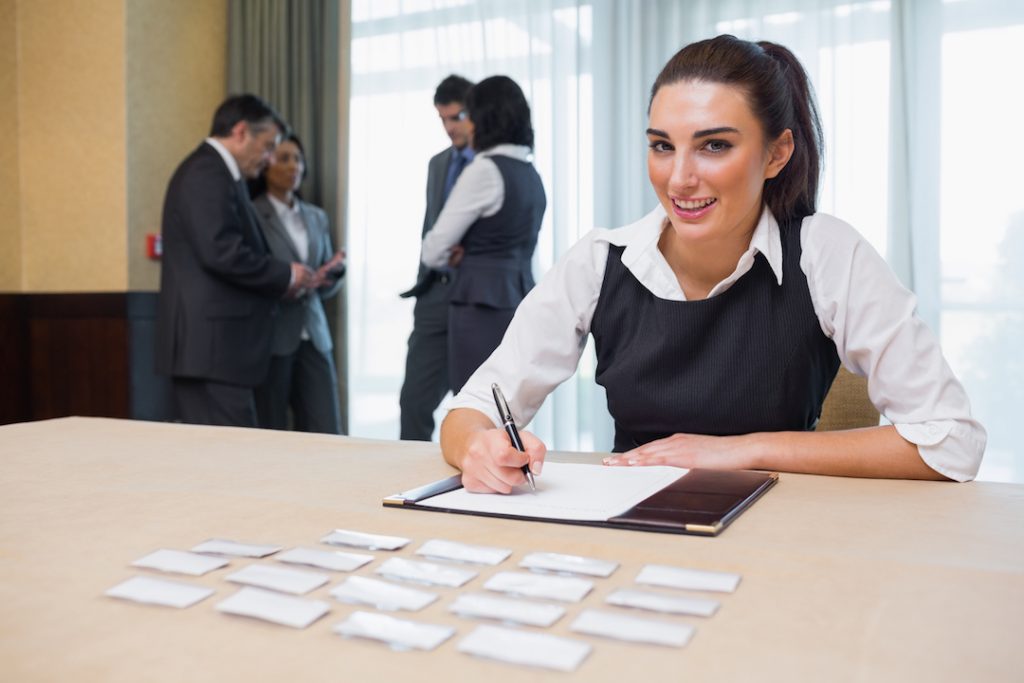 Smiling woman at welcome desk at business conference